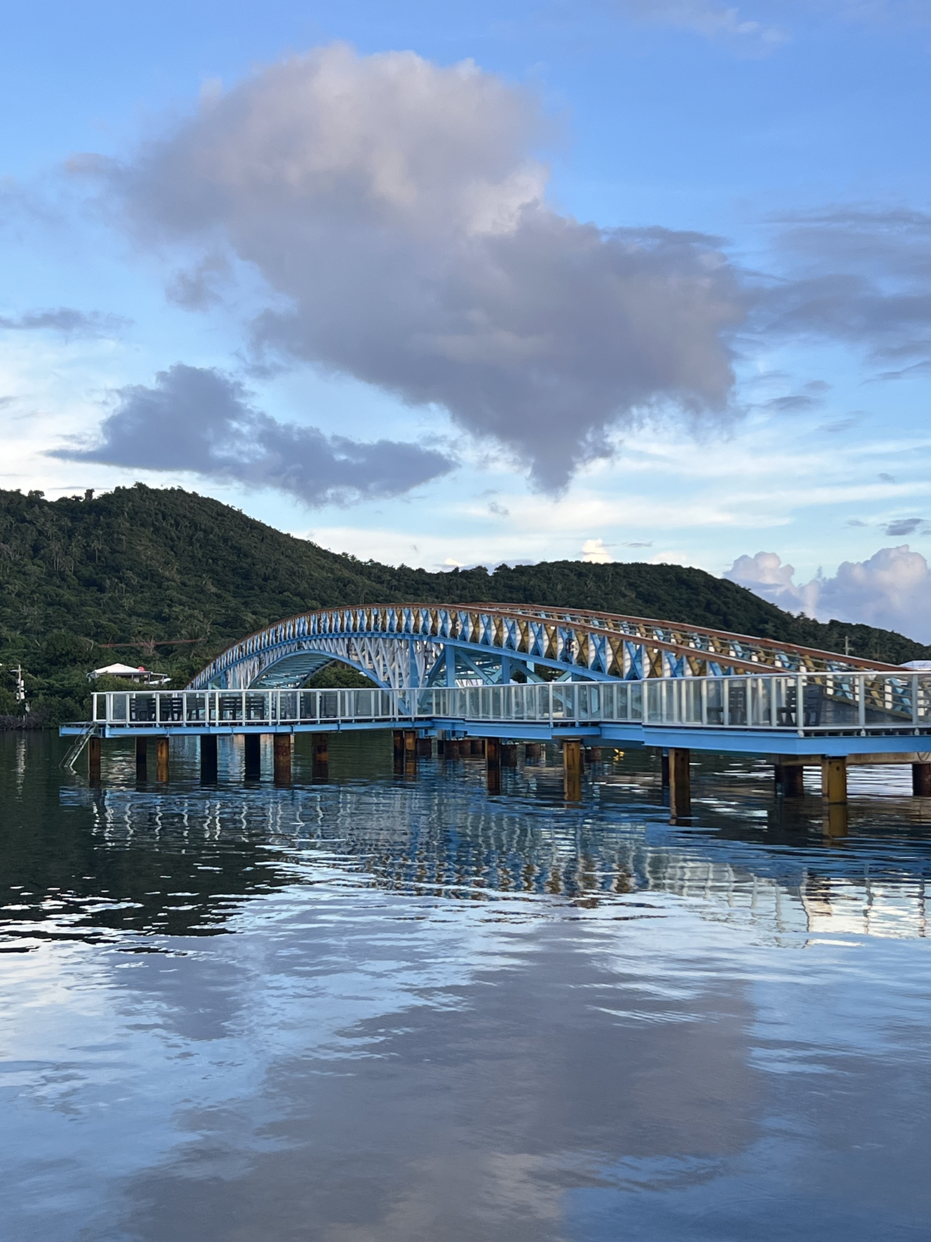 Arrivés sur l’île de Santa Catalina… petite sœur de Providencia, mais à seulement 3 minutes à pied, après avoir traversé le pont des amoureux, coloré et éclairé la nuit.